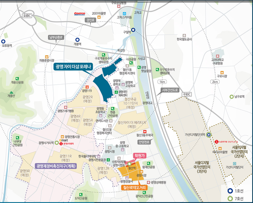 *장점: 광명시 자체는 처음부터 서울의 인근의 위성도시로서 베드타운의 성격이 강합니다. 때문에 광명시 자체적으로 큰 수요를 빨아들일만한 산업체는 없는 편입니다. 하지만 서울 주요 업무지구까지 교통 접근성 가장 큰 장점중의 하나로 꼽힙니다. 더샵 포레나 자이의 위치는 이런 교통접근성의 측면에 장점을 갖추고 있습니다. 서울 지하철 승하차 인원 1위인 '가산디지털 단지역'까지 1호선 개봉역을 통해 도착할 수 있습니다.