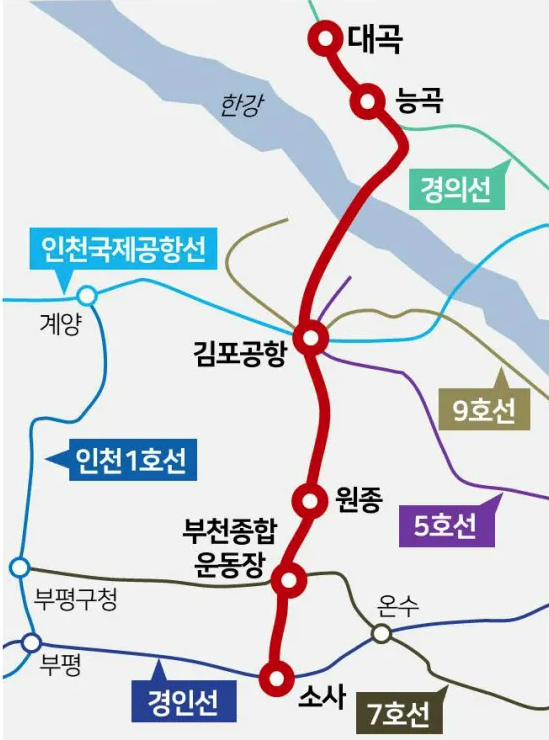대곡소사선은 수도권 서북부 남부철도망으로서 대곡역(3호선,경의중앙선)과 소사역(1호선)을 연결하는 노선입니다. 총 18.3 km 구간으로 5개의 전철역을 관통합니다.