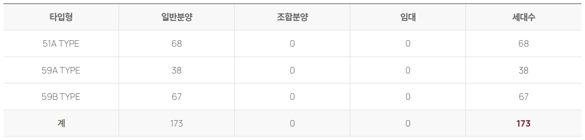 이번 분양계획에는 전용 84타입은 전체 조합원 분양으로 물량이 없고, 전용 59이하 타입만 분양대상입니다.