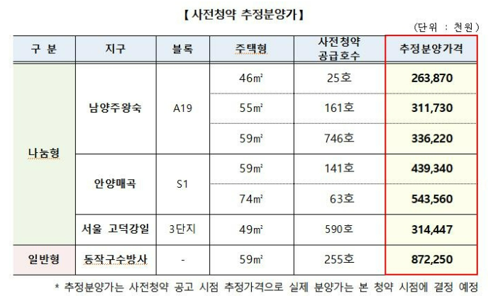 해당 분양은 '일반형' 분양으로서 분양가 상한제가 적용되는 단지이다. 주변 시세의 80% 수준으로 공급하며, 청년층에게는 대출한도와 금리를 우대합니다. '나눔형'과는 다르게 국가와 시세차익 공유에 대한 의무가 없습니다. 가장 궁금하실 추정분양가는 8억 7천만원 초반으로 예상되고 있습니다.