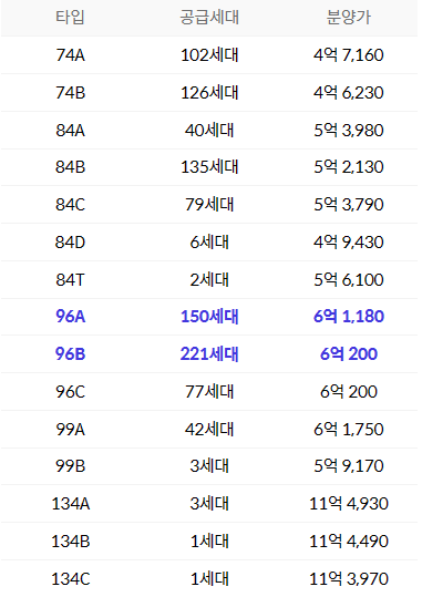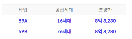 분양가격을 알아보겠습니다. 타입은 전용 59 Type(25평형) 단일 형태입니다. 중층 기준으로 82,220만원 ~ 88,230만원 가량입니다. 평당 3,290만원 ~ 3,530만원 사이입니다.