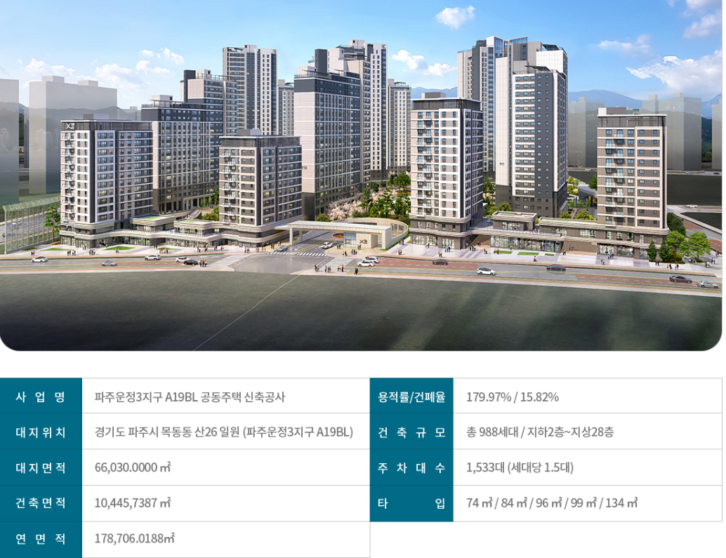 운정자이 시그니처는 경기도 파주시 운정지구에 공급하는 988세대의 단지입니다. 용적률도 신축임을 감안하면 180%가량으로 쾌적한 편으로 예상됩니다.
