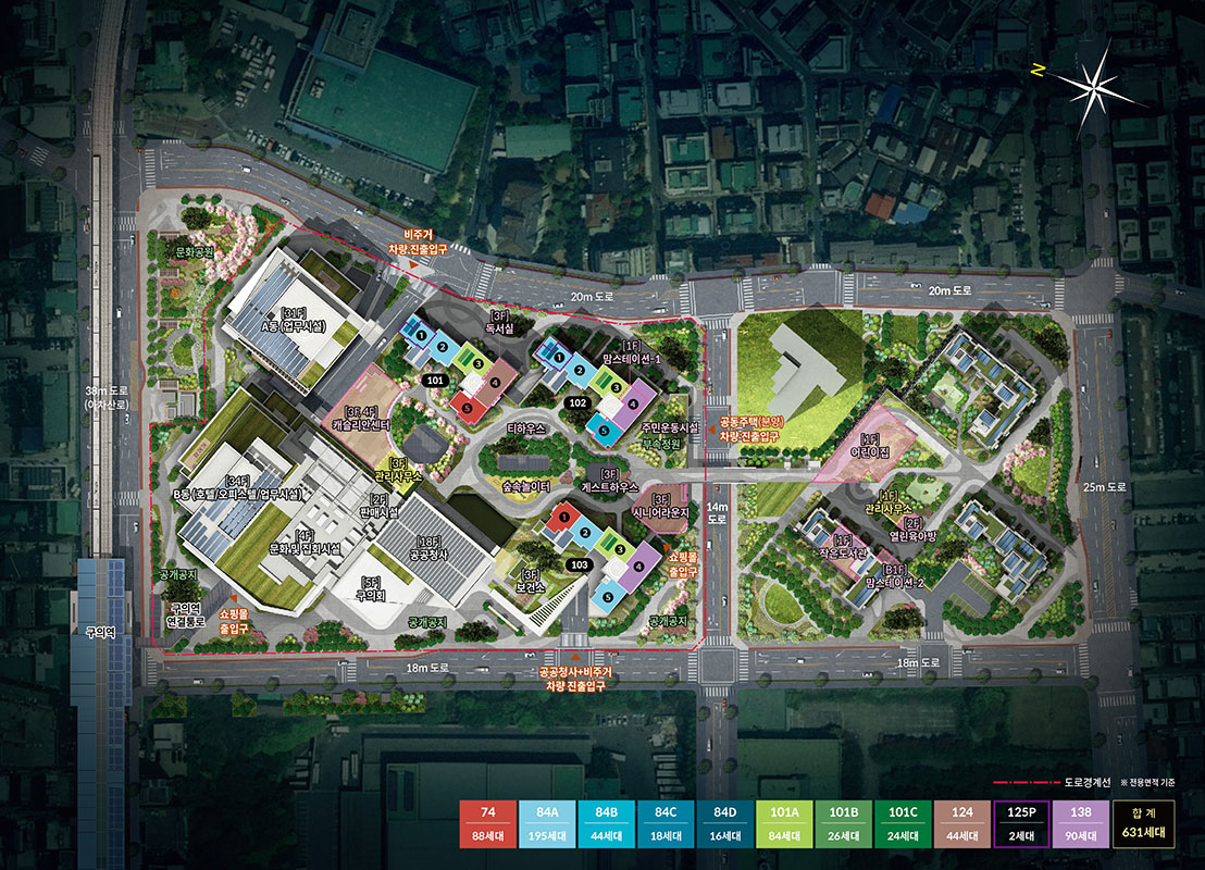 - 공급규모: 일반분양 631세대 (총 1,063세대) / 74형 88세대, 84형 273세대, 101형 134세대, 124형 44세대, 138형 90세대, 125 펜트하우스 2세대