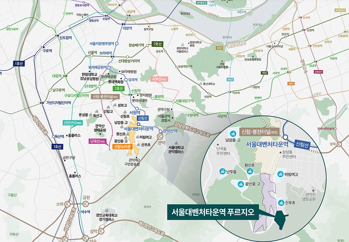 해당 단지는 총 6100세대가 입주예정인 서남권 최대의 재개발로 알려진 신림뉴타운의 첫 번째 분양 단지입니다. 아직은 교통 기반이 약해서 지하철역은 신림선 서울대벤처타운역을 이용할 수 있으나, 거리가 도보로는 약 20분 정도의 거리이기 때문에 도보 이용은 어려울 것으로 보입니다.